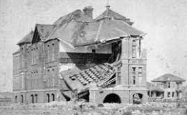 One entire wall of the Bath Avenue School dropped away, exposing a collapsed third floor with pupils' desks still attached in neat rows. Desks remained attached to the floor of the Bath Avenue School after the 1900 Storm hit Galveston Island on September 8, 1900. The school closed permanently after the storm had passed through and deterred away. (Ref: https://www.cram.com/essay/1900-Hurricane-Research-Paper/FJJ7XZWV3T)